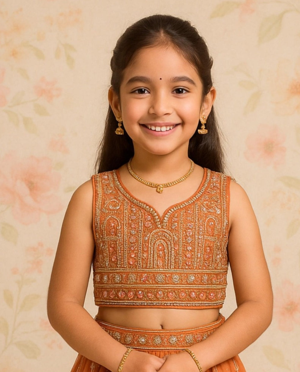 Let your little princess shine in this vibrant Orange Lehenga Choli, designed with exquisite embroidery and detailed craftsmanship. The sleeveless choli paired with a flared lehenga gives a traditional yet elegant look. Perfect for weddings, festive events, and cultural celebrations, this attire combines comfort with royal charm.