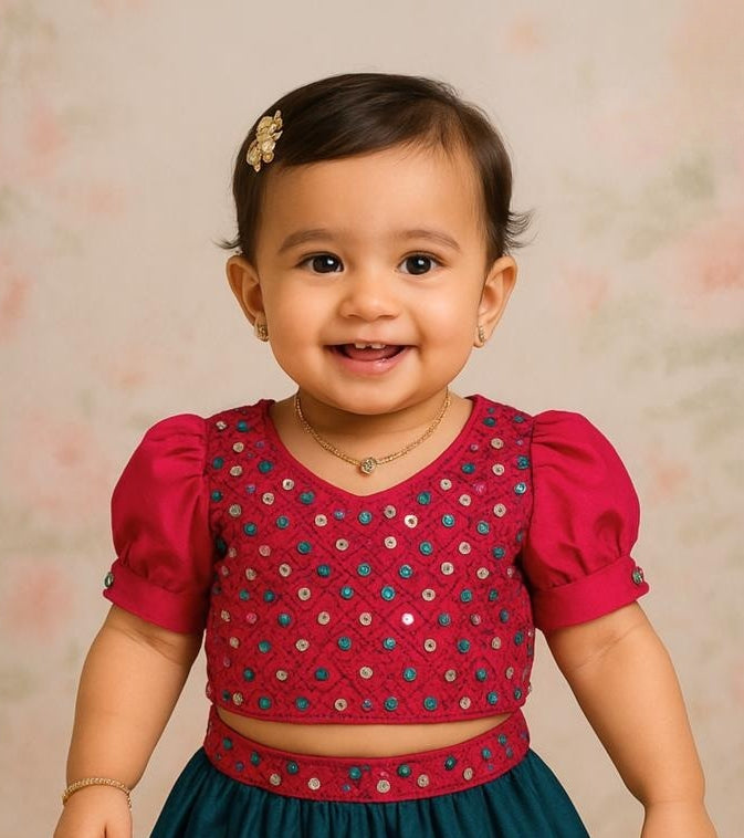 Bright, joyful, and full of charm — this fuchsia pink and teal lehenga set brings festive beauty to life. The puff-sleeved blouse with mirror embroidery pairs perfectly with the floral embroidered skirt, creating a look that’s timeless yet adorable. Designed from soft cotton fabric, it ensures your little one stays comfortable while stealing hearts at every celebration. Perfect for weddings, festive occasions, and family gatherings, this outfit defines playful elegance with traditional grace.