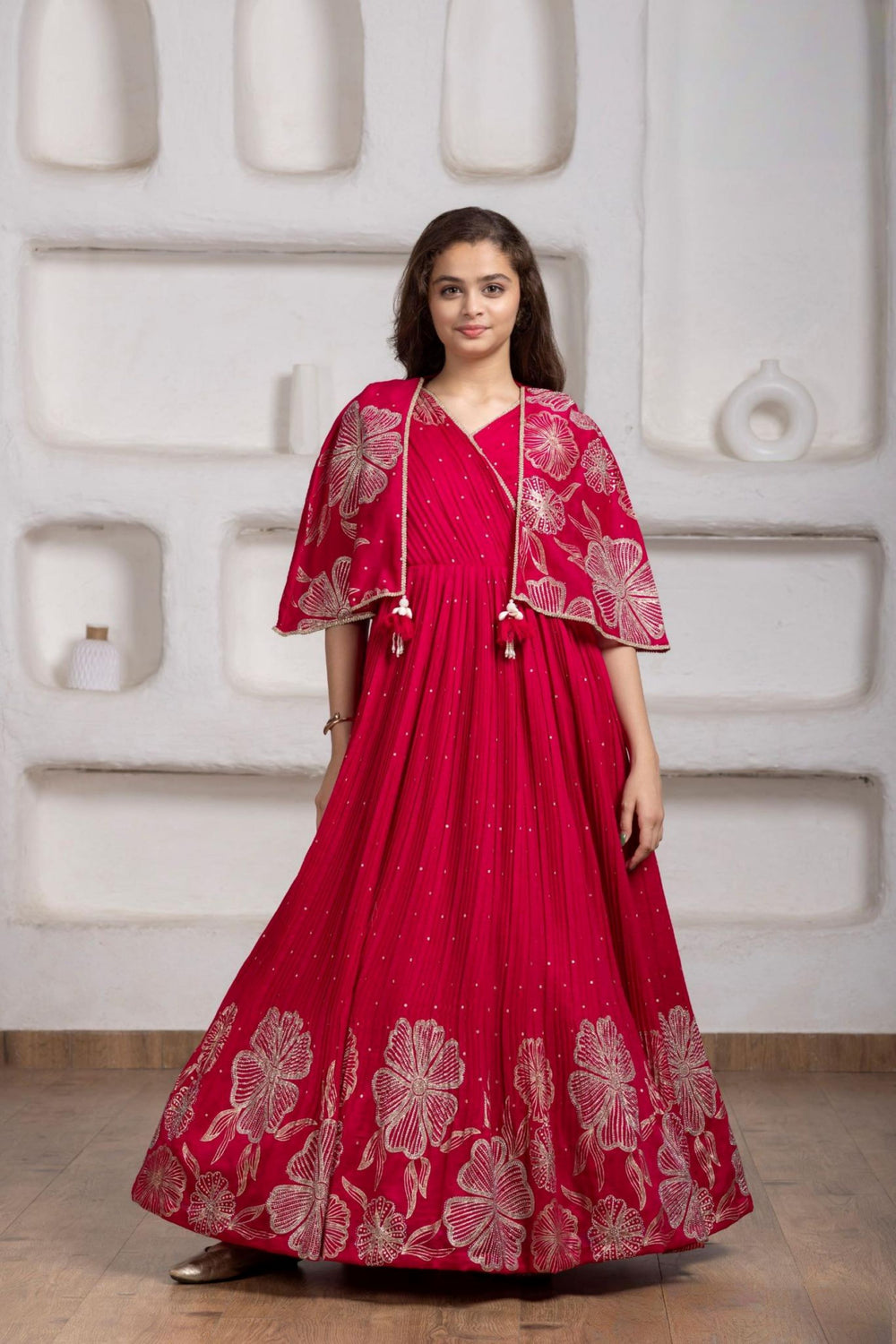 Introducing our luxurious Crimson Bloom Pleated Anarkali Set – an enchanting ensemble tailored for the modern young diva who loves to embrace tradition with elegance. This stunning deep crimson-red Anarkali gown is crafted in rich georgette, adorned with delicate mirror work that shimmers subtly with every movement. The highlight? A statement embroidered cape with oversized floral motifs and tassel detailing, adding an ethereal charm and royal touch to the entire look.