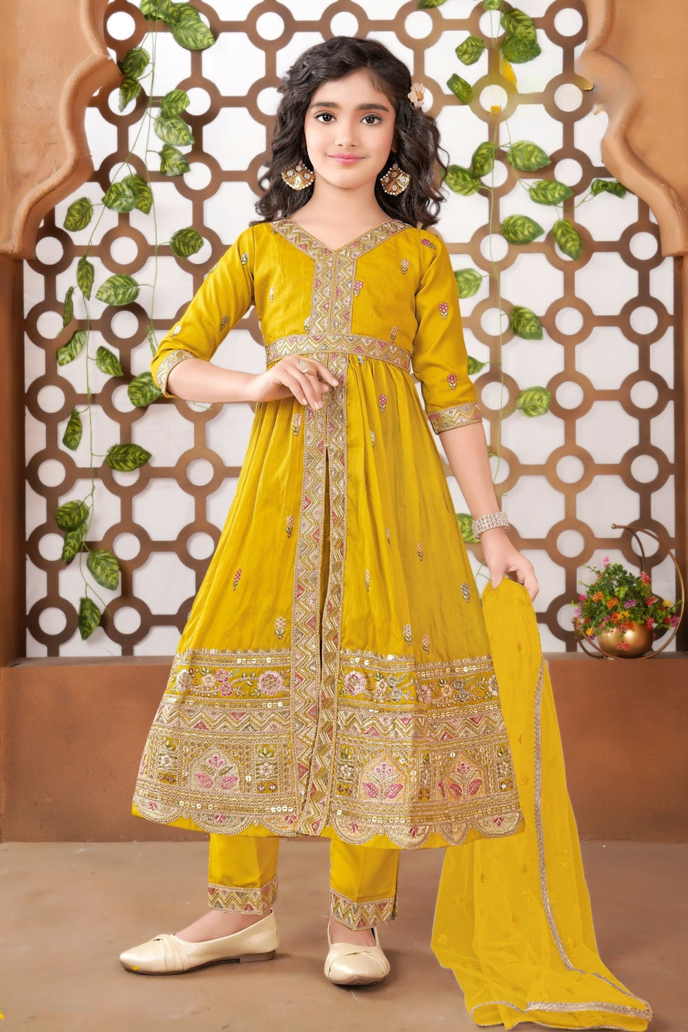 Give your little fashionista the ultimate ethnic charm with this stunning mustard yellow Anarkali suit set. Adorned with rich embroidery, zari, and mirror work, this set is a perfect blend of tradition and modern style. Comes complete with matching pants and a soft net dupatta — ideal for weddings, festivals, and grand celebrations.