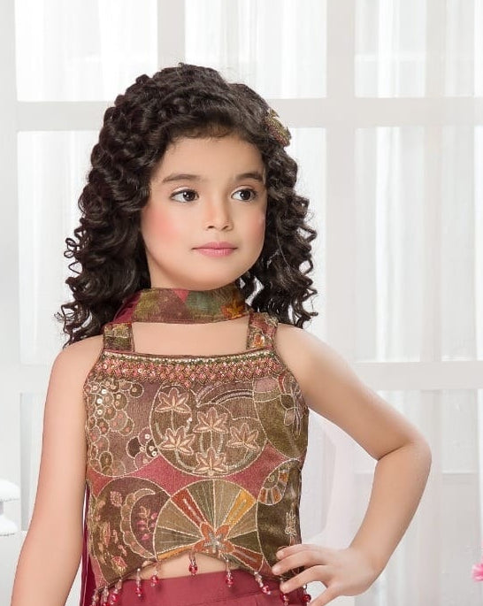 Add royal flair to your little girl’s wardrobe with this gorgeous wine-colored palazzo set. The intricately embroidered crop top features a unique choker neckline and rich ethnic detailing, making it a true showstopper. Paired with flared palazzos, this look balances tradition with contemporary style—perfect for weddings, festive events, or any special occasion.