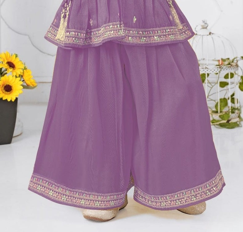 Let your little one shine in this enchanting Royal Orchid Sharara Set, featuring a sleeveless peplum-style kurti paired with a flared sharara. The delicate embroidery in golden threads adds a regal charm to the rich lavender-purple hue. Perfect for festive occasions, weddings, or ethnic celebrations, this outfit blends elegance and comfort, keeping your child stylish and at ease.