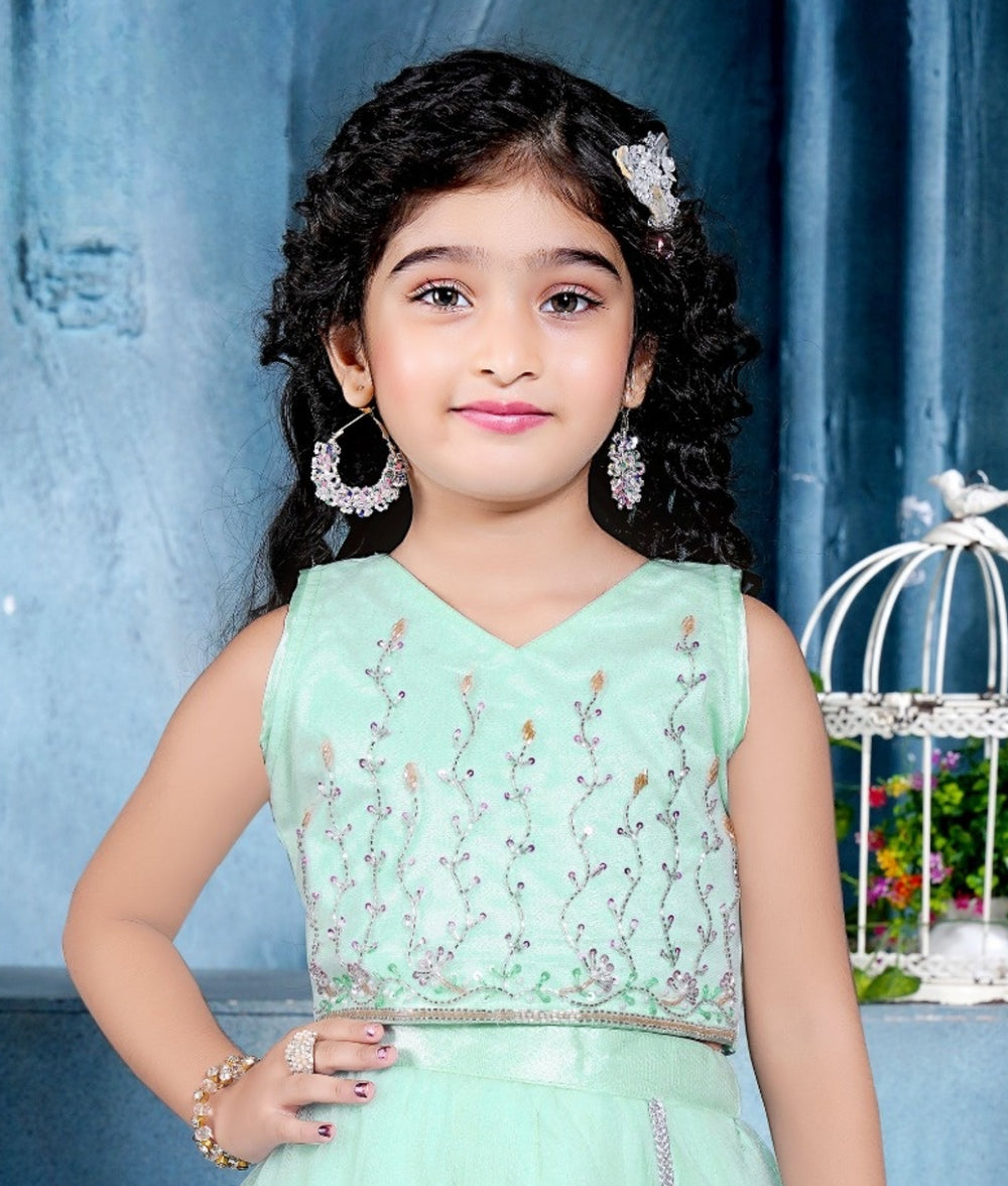 A dreamy mint green gown that defines grace and poise for your little fashionista. Crafted in fine net fabric, it features delicate floral embroidery with pastel tones of pink and lilac. The sleeveless bodice and flowy silhouette make it perfect for birthdays, celebrations, and festive occasions. Finished with a crystal belt and tassel detailing, it’s a picture-perfect outfit for her special moments.
