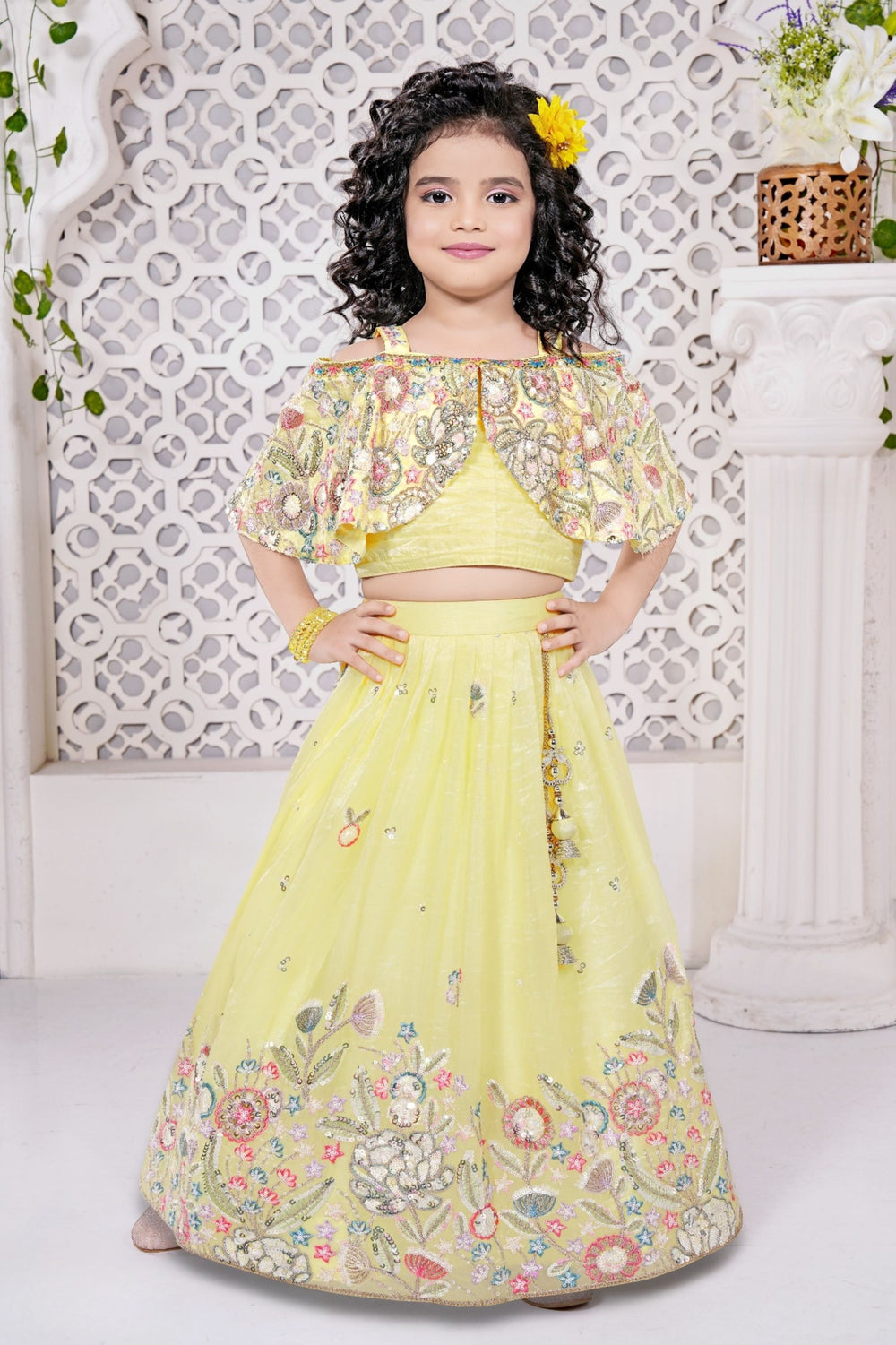 This stunning Yellow Embroidered Lehenga Choli set is the perfect festive outfit for your little princess. Crafted in a bright and cheerful yellow tone, the set features a beautifully embroidered cape-style blouse paired with a flared lehenga skirt. The floral and sequin embroidery enhances its charm, making it a showstopper for weddings, parties, and festive occasions. Designed to be stylish yet comfortable, this outfit allows your child to shine with elegance and ease.