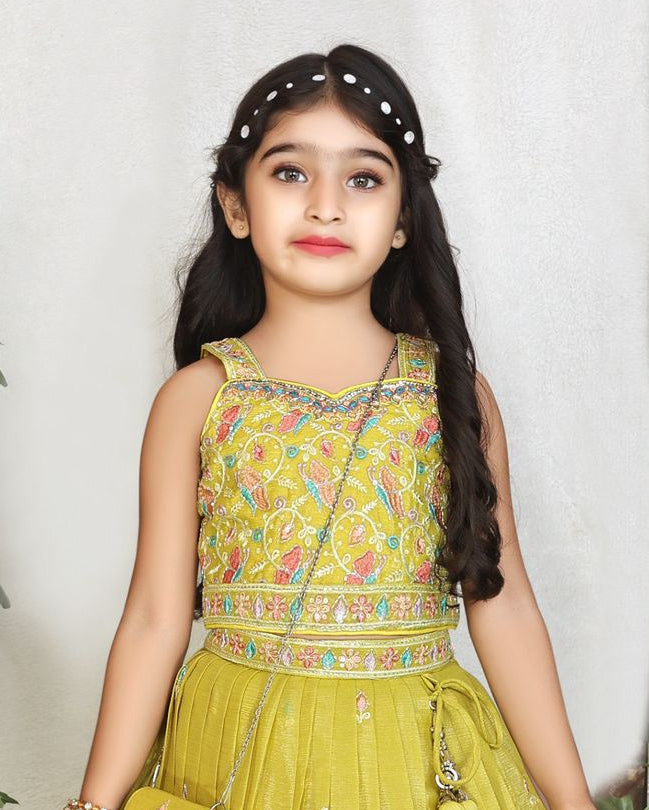 This stunning lime-yellow lehenga choli set is crafted with vibrant multi-color embroidery, making it a perfect choice for festive and special occasions. The embroidered choli features intricate patterns with a beautifully finished neckline, while the full-flare lehenga showcases detailed butterfly and floral embroidery along the border. The soft fabric with a graceful fall ensures comfort and elegance. Enhanced with stylish tassels and a matching mini purse, this outfit brings together tradition and modern charm in the most delightful way.
