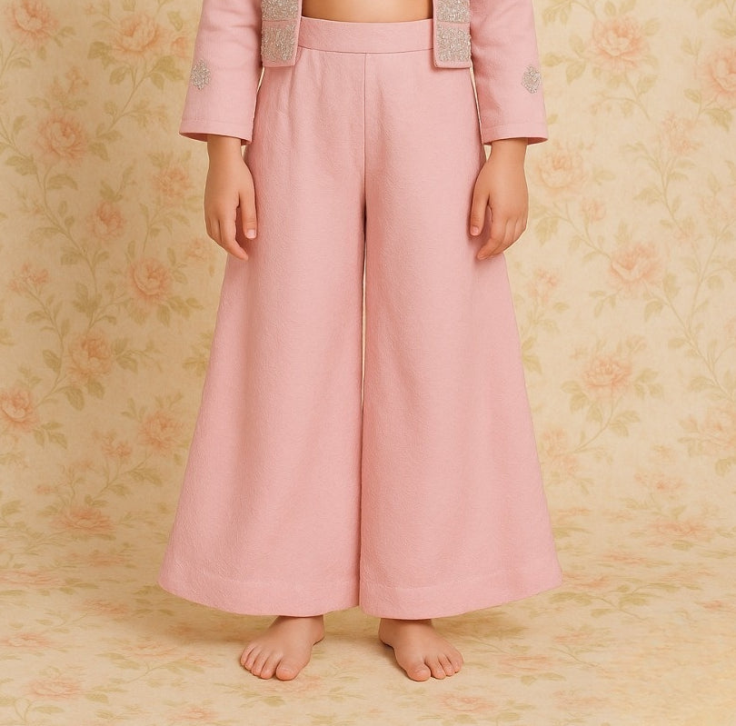 Elevate your little one’s festive wardrobe with this Blush Pink Three-Piece Party Set. Designed with elegance and comfort in mind, the set features a shimmering embellished crop top, a matching flowy palazzo pant, and a stylish jacket with delicate embroidery. Perfect for weddings, birthdays, and festive occasions, this outfit blends luxury detailing with effortless wearability.