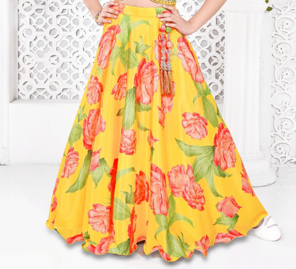 Brighten up your little one’s festive look with this vibrant yellow floral lehenga choli set. The intricately embroidered blouse is adorned with colorful beadwork, perfectly paired with a flowy lehenga skirt featuring bold floral prints in red and green tones. Designed for comfort and elegance, this outfit is ideal for weddings, parties, and festive occasions.