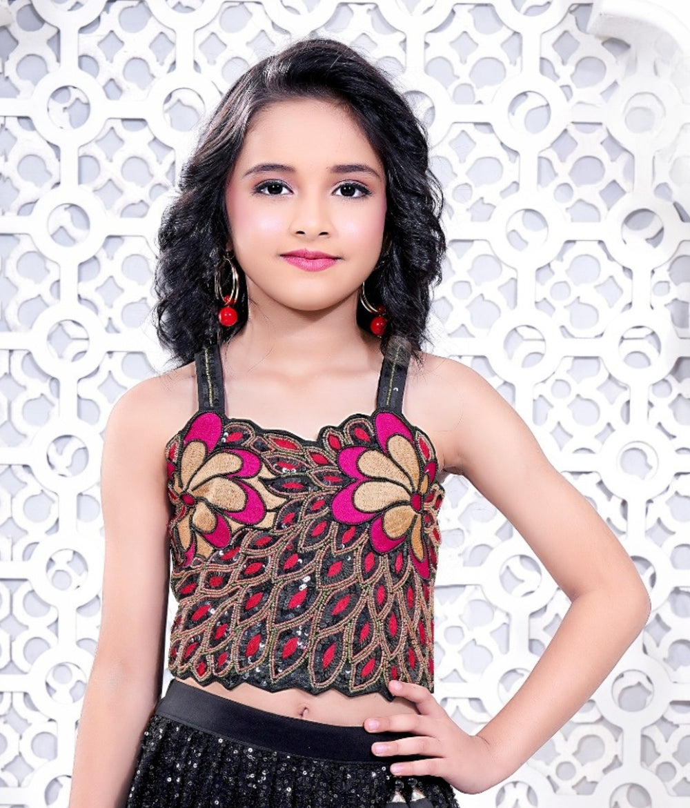 This stunning Black Embroidered Lehenga Set is crafted for little fashionistas who love to shine at special occasions. The sequin-embellished black lehenga pairs beautifully with a richly embroidered floral blouse, featuring bold pink and gold threadwork. Elegant tassel details complete the festive charm, making it the perfect outfit for weddings, receptions, and celebrations.