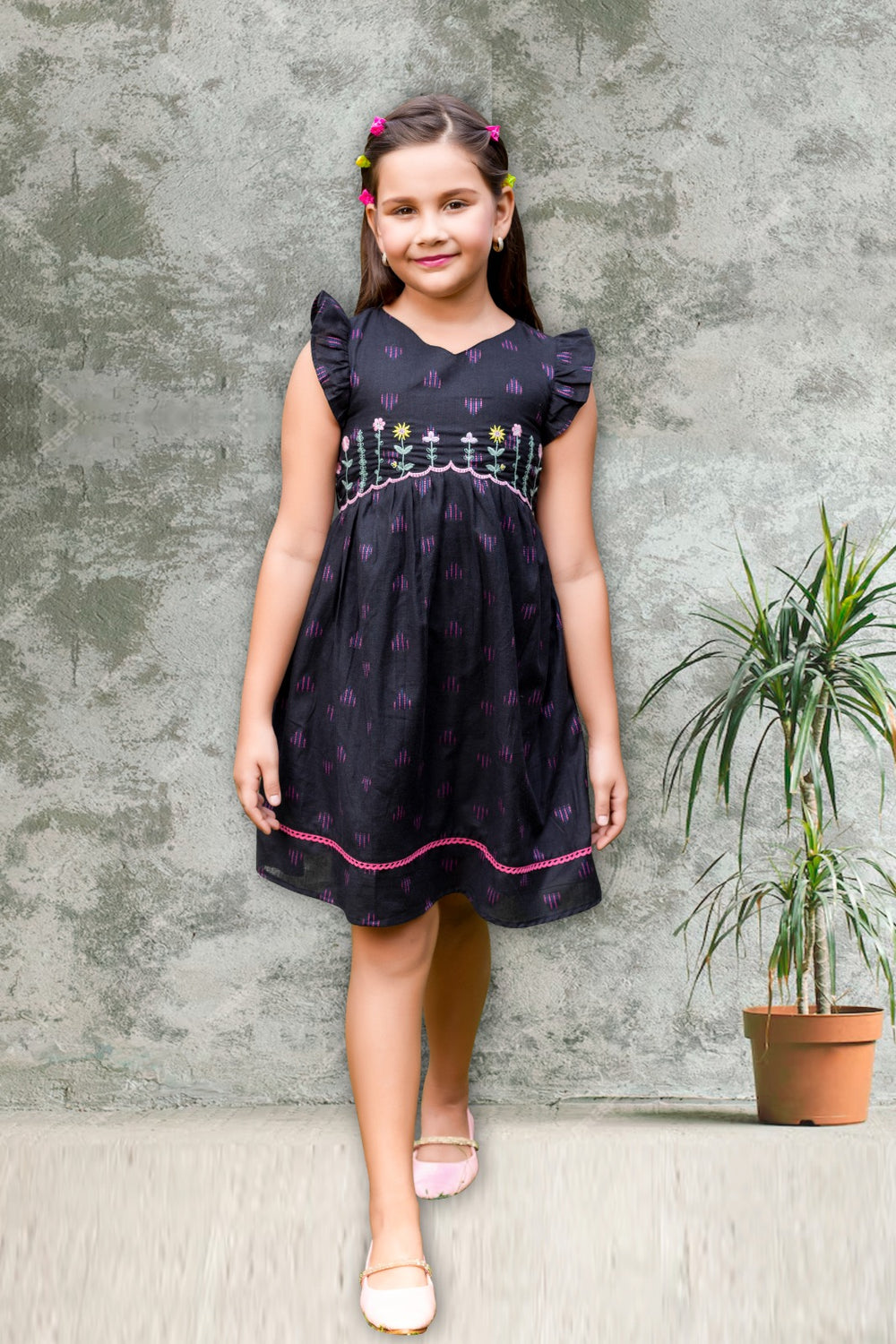 Chic meets tradition in this elegant black frock designed for stylish little girls. Adorned with subtle woven ikat patterns and colorful floral threadwork, this dress blends ethnic charm with playful sophistication. Perfect for casual outings, festivals, or family functions!