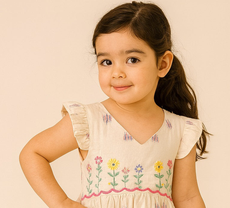 This charming off-white frock brings timeless grace to your little one's wardrobe. Adorned with delicate hand embroidery featuring cheerful flowers and soft pink trims, it’s a perfect pick for festive gatherings, casual occasions, or twirl-worthy playdates. The flutter sleeves and relaxed flare add just the right amount of cuteness and comfort.