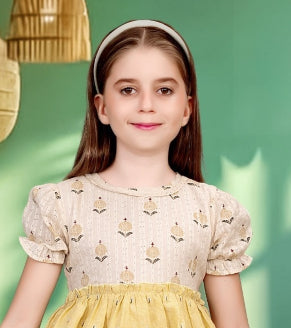 Brighten up her day with this cheerful yellow frock that perfectly blends subtle ethnic design with modern charm. Featuring an embroidered yoke and a delicately patterned flared bottom, this dress is a perfect pick for festive occasions, birthdays, or cultural functions.