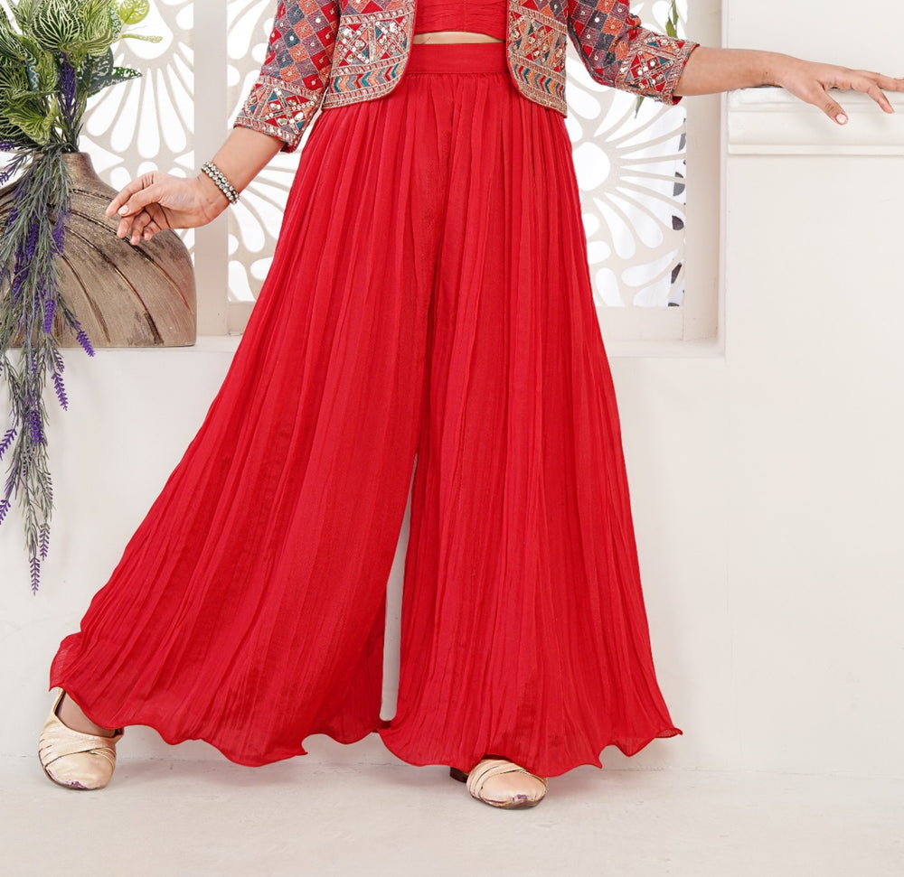 Elegant, modern, and effortlessly festive — this red sharara set is designed to make every occasion special. The outfit features a ruched crop top and flared palazzo pants paired with a beautifully embroidered ethnic jacket, blending traditional charm with contemporary flair. Made from soft, flowy fabric for all-day comfort, this ensemble brings out sophistication and confidence in every little girl. Perfect for festive celebrations, family gatherings, and special occasions.