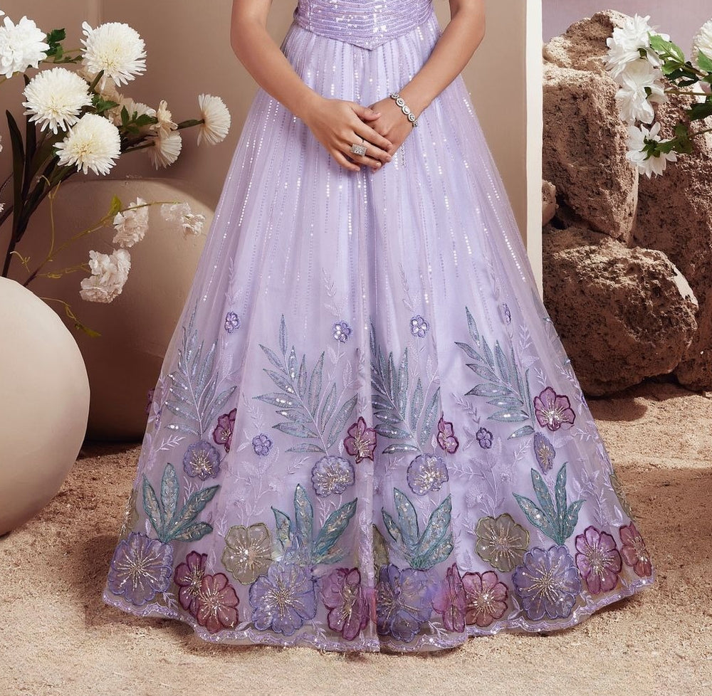 A vision of charm and shimmer — this lilac gown beautifully balances elegance with youthful radiance. The bodice is adorned with delicate linear sequin embroidery, while the lower flare blooms into an exquisite garden of multicolor 3D floral motifs and leaf appliqués. Crafted in soft net with satin lining, it promises both comfort and grandeur — perfect for birthdays, weddings, and festive occasions where your princess deserves the spotlight.