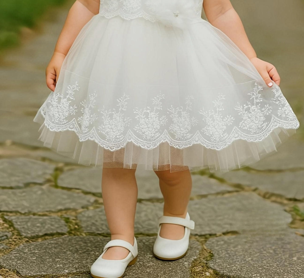 A timeless white embroidered dress designed to capture pure innocence and elegance. Crafted from soft tulle and premium organza, the dress features delicate floral embroidery along the bodice and hem, creating a gentle and graceful look. The layered flare adds volume without heaviness, allowing easy movement and all-day comfort. A subtle floral appliqué enhances the bodice, giving the dress a charming finishing touch. Perfect for outdoor celebrations, photoshoots, and special occasions, this dress brings together simplicity, beauty, and sophistication.