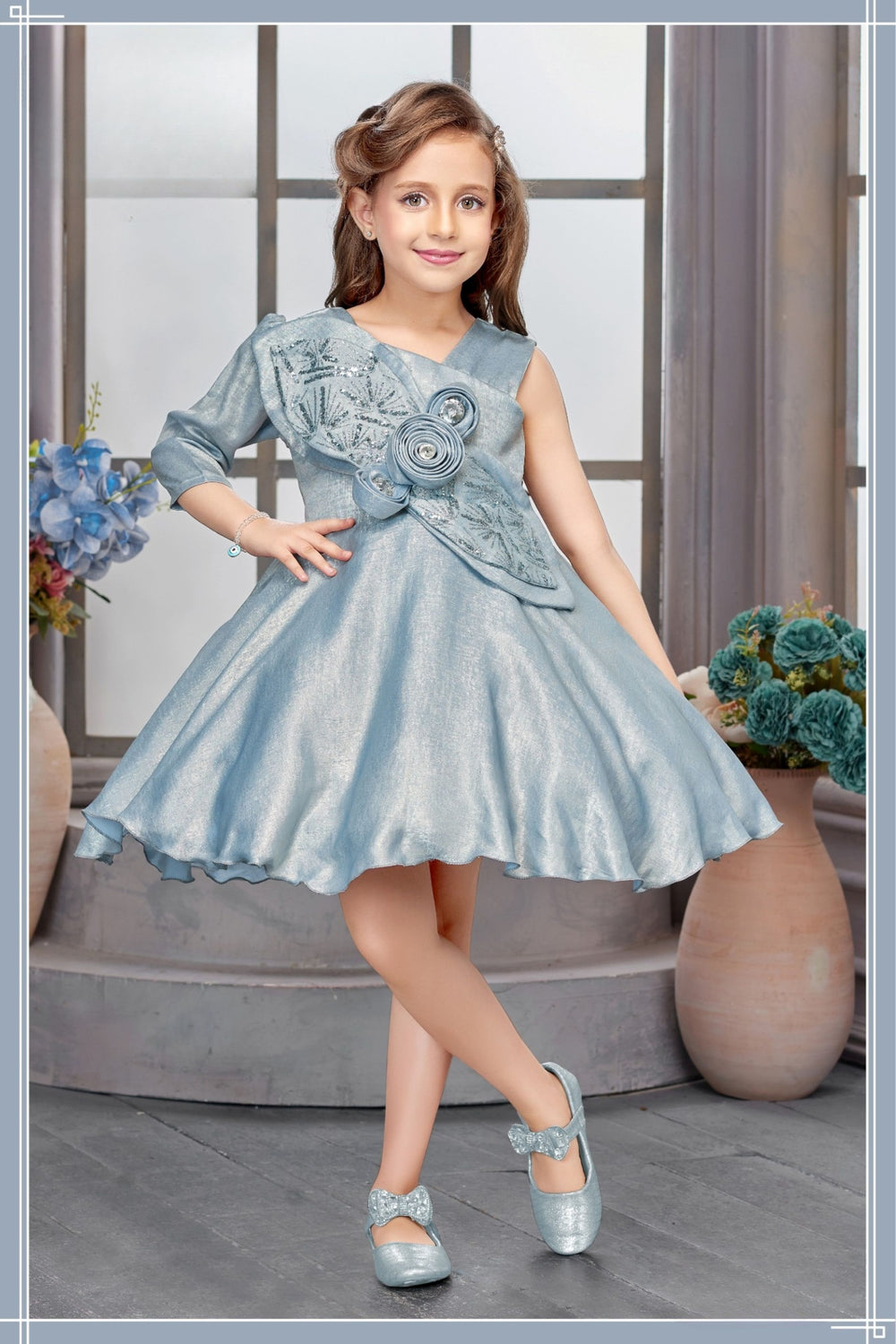 A sophisticated pastel blue party dress designed with a unique asymmetric overlay for an elevated couture look. Crafted from premium shimmer fabric, the gown offers a soft metallic glow that enhances its elegance. The bodice features an artistic embroidered panel adorned with sequins and handcrafted floral appliques, giving the dress a refined, statement-making touch. The flared circular skirt moves gracefully with every step, ensuring both style and comfort. Perfect for grand celebrations, this dress blends high fashion and delicate craftsmanship.