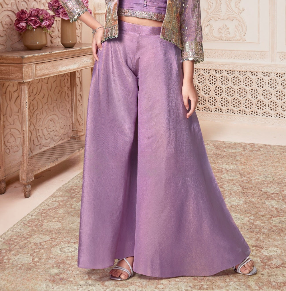This Lavender Palazzo Set with Jacket is a graceful fusion of style and sophistication. Featuring a structured crop top with subtle detailing, flowy wide-legged palazzo pants, and an embroidered sheer jacket, this outfit is designed to bring elegance to every festive or party look. Its soft lavender hue adds a touch of charm, making it perfect for special celebrations and traditional occasions.