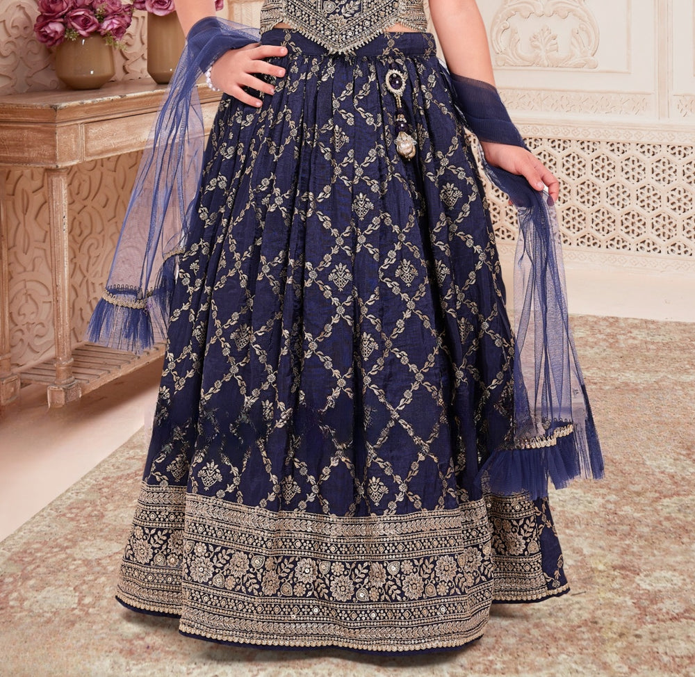 Give your little one a royal look with this Navy Blue Lehenga Choli Set. Crafted with rich embroidery and intricate zari work, this outfit includes a sleeveless choli, flared lehenga, and a matching net dupatta. The deep navy blue color with golden detailing makes it a perfect choice for weddings, festive occasions, and grand celebrations.