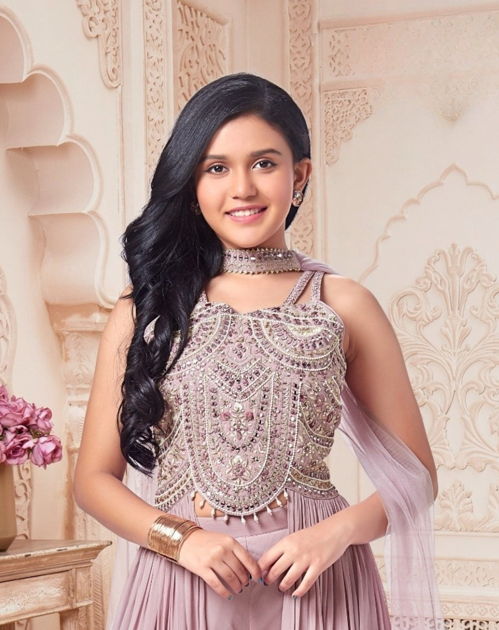 Step into elegance with this stunning pastel mauve ensemble designed for young girls who love to dress with charm and grace. The outfit features a beautifully embellished sleeveless blouse with intricate embroidery and beadwork, paired with flowy layered palazzo pants that add a touch of sophistication. A delicate dupatta completes the set, making it a perfect choice for weddings, festive occasions, or family celebrations.