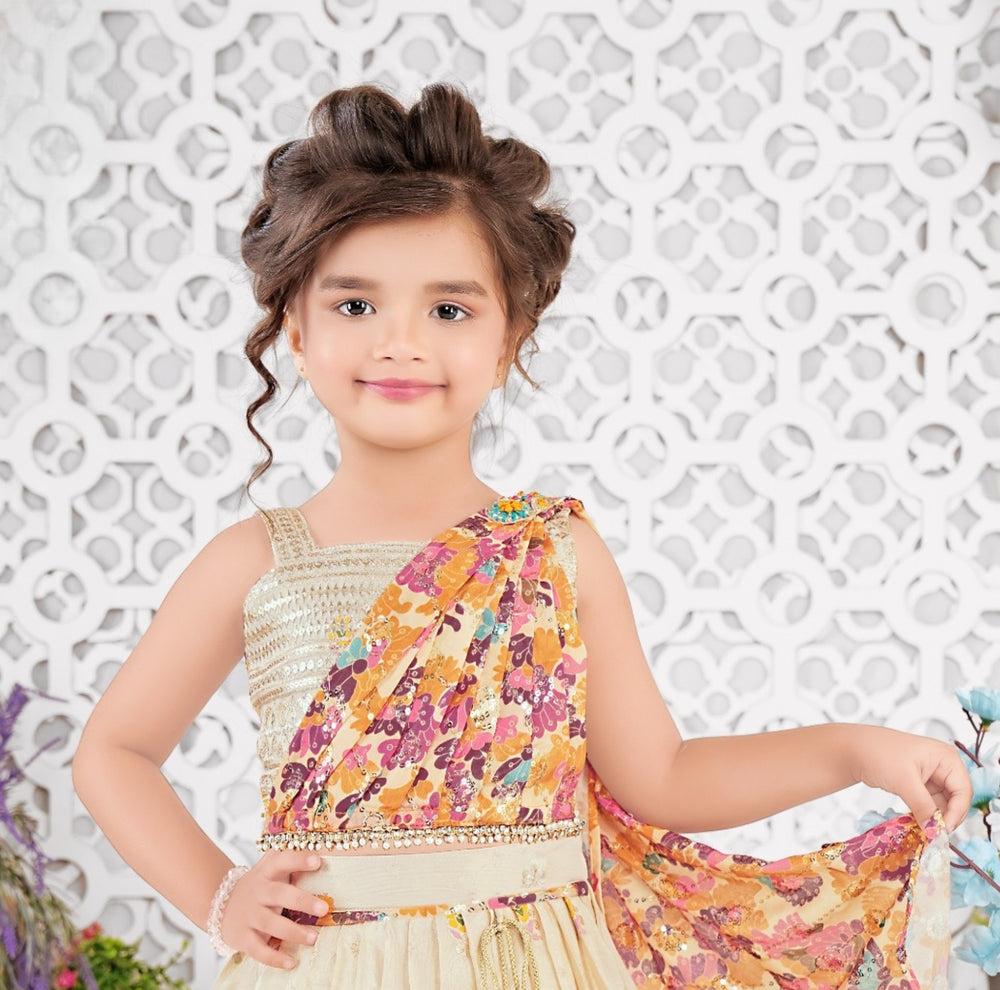A charming blend of tradition and elegance, this cream lehenga choli set with a vibrant floral printed dupatta is designed for your little princess. The lightweight fabric and intricate embroidery add festive charm, while the colorful dupatta enhances the look with a playful touch. Perfect for weddings, parties, and festive celebrations.