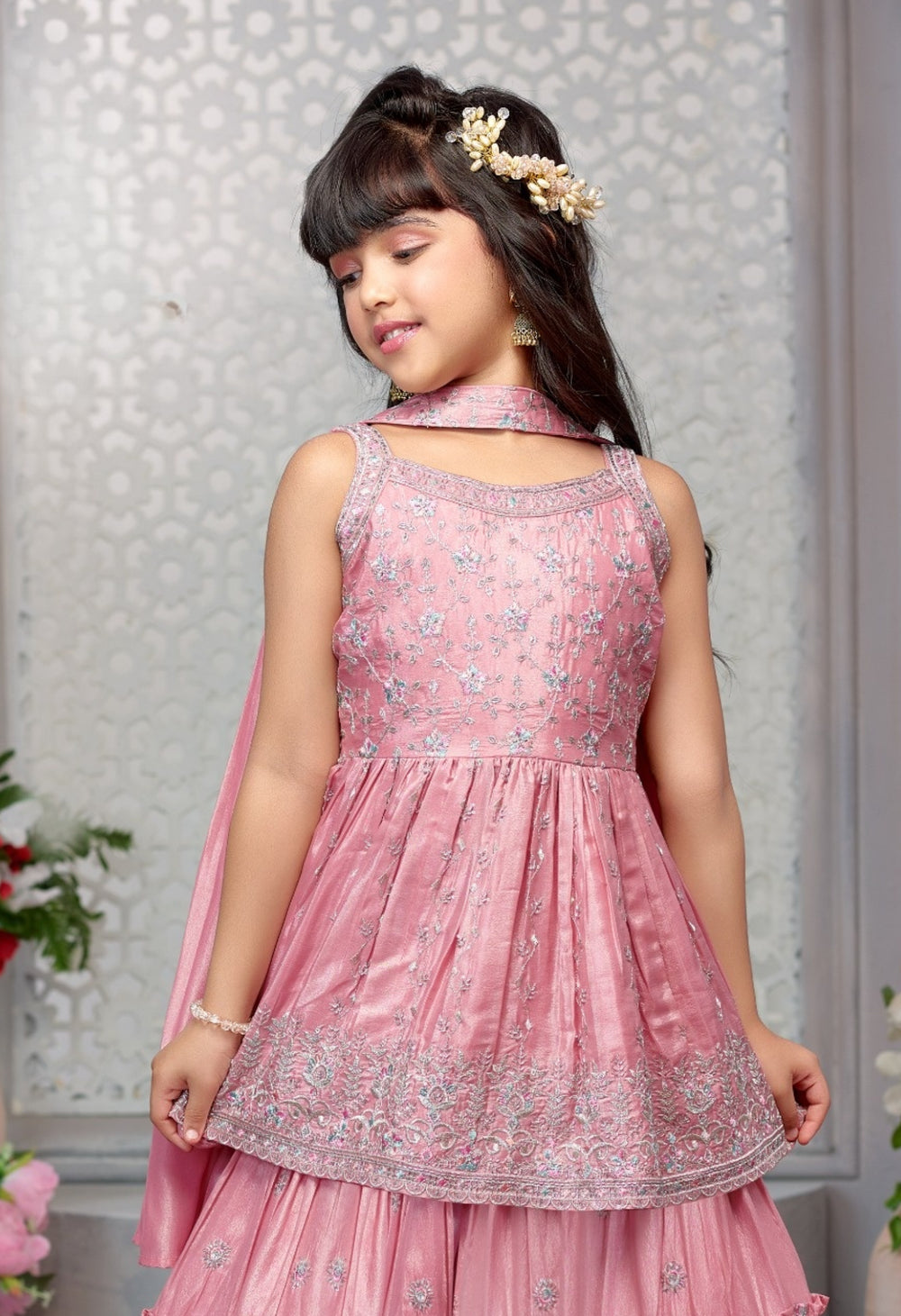 Elevate your little princess’s charm with this blush pink embroidered peplum sharara set, crafted with intricate thread and sequin detailing. The tiered sharara pants add volume and grace, while the delicately embellished peplum top ensures a modern yet traditional festive look. Perfect for weddings, parties, and special occasions.