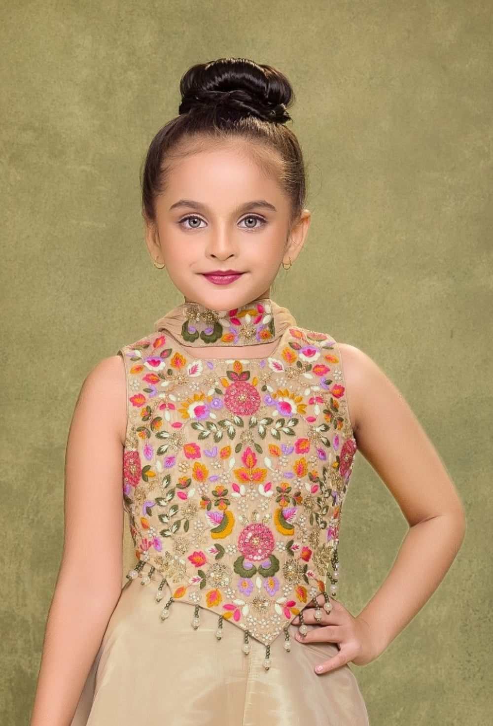 A perfect blend of elegance and charm, this Beige Palazzo Set is designed for your little princess to shine on every special occasion. The beautifully embroidered multicolor floral top adds a festive touch, while the wide beige palazzo ensures comfort with a modern ethnic style. This sleeveless ensemble is a graceful pick for weddings, festivals, and celebrations.