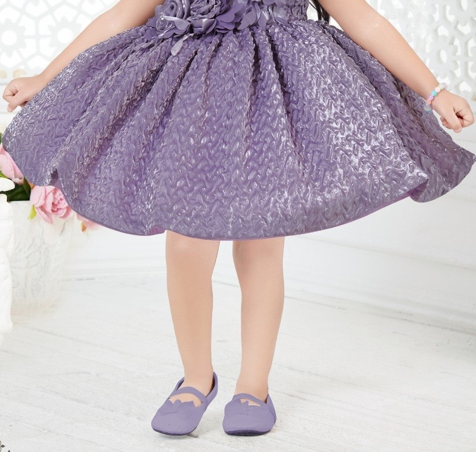 Dress your little girl in elegance with our Ayla Lavender Party Frock, crafted with a unique luxury textured satin fabric and adorned with beautiful 3D floral appliqué. The trendy off-shoulder neckline with soft shoulder straps adds a touch of grace, while the voluminous pleated skirt ensures the perfect twirl for any special event.
