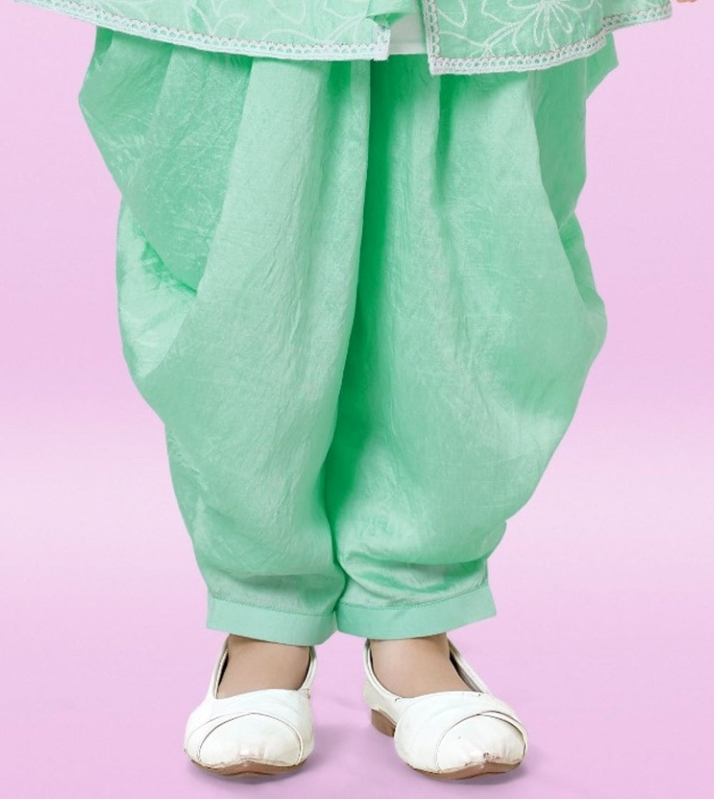 Add a refreshing and festive charm to your little girl’s wardrobe with this elegant Mint Green Kurta Set. Designed with beautiful thread floral embroidery and delicate lace detailing, this outfit features a stylish tie-up kurta, comfortable dhoti pants, and a matching soft dupatta. Perfect for family gatherings, festivals, and cultural functions.