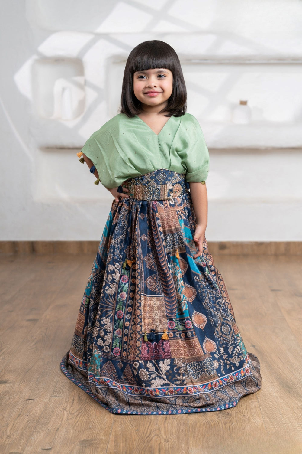 Dress your little fashionista in this Pastel Mint Green Crop Top & Ethnic Royal Blue Lehenga Set, a perfect blend of comfort and traditional elegance. The soft pastel crop top with colorful tassel detailing and a flare ethnic lehenga skirt gives a rich festive vibe—perfect for weddings, festivals, and special celebrations.