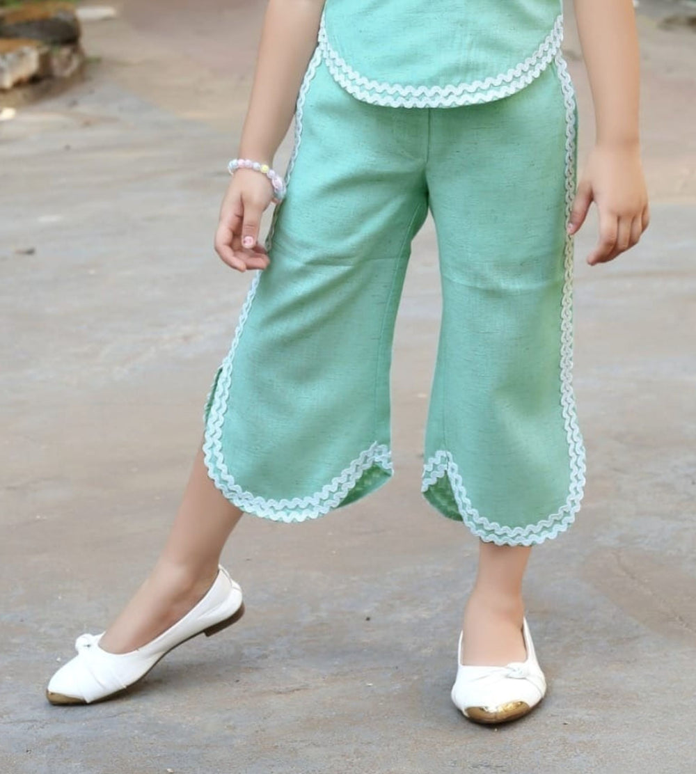 This charming Mint Green Summer Co-ord Set is the perfect combination of comfort and style for your little fashionista. Crafted in a breezy fabric with cute wavy lace trims, this two-piece outfit is ideal for casual outings, summer playdates, and festive gatherings. The sleeveless top and flared pants ensure easy movement with a trendy flair!