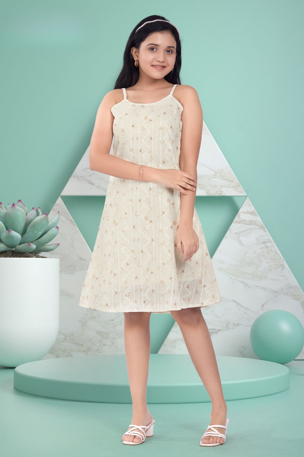 Radiate subtle charm and modern elegance with this off-white sleeveless dress, adorned with delicate floral embroidery. The breathable fabric, flattering A-line silhouette, and soft straps make it a perfect outfit for summer outings, casual parties, or family gatherings. Minimal yet chic — an absolute wardrobe essential!