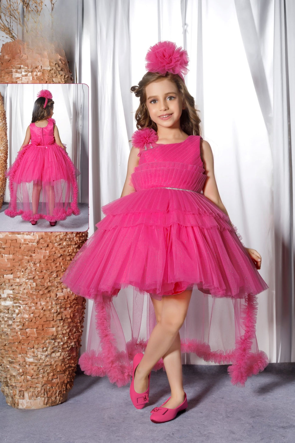 Let your little princess shine bright in this Gajri Pink High-Low Party Gown, featuring a modern asymmetrical hemline with a glamorous trail. The dress is adorned with layered soft tulle ruffles, a cute floral brooch on the shoulder, and a matching fancy hairband. Designed for birthdays, events, and photoshoots — this gown makes every moment special with its elegant charm and comfort fit.