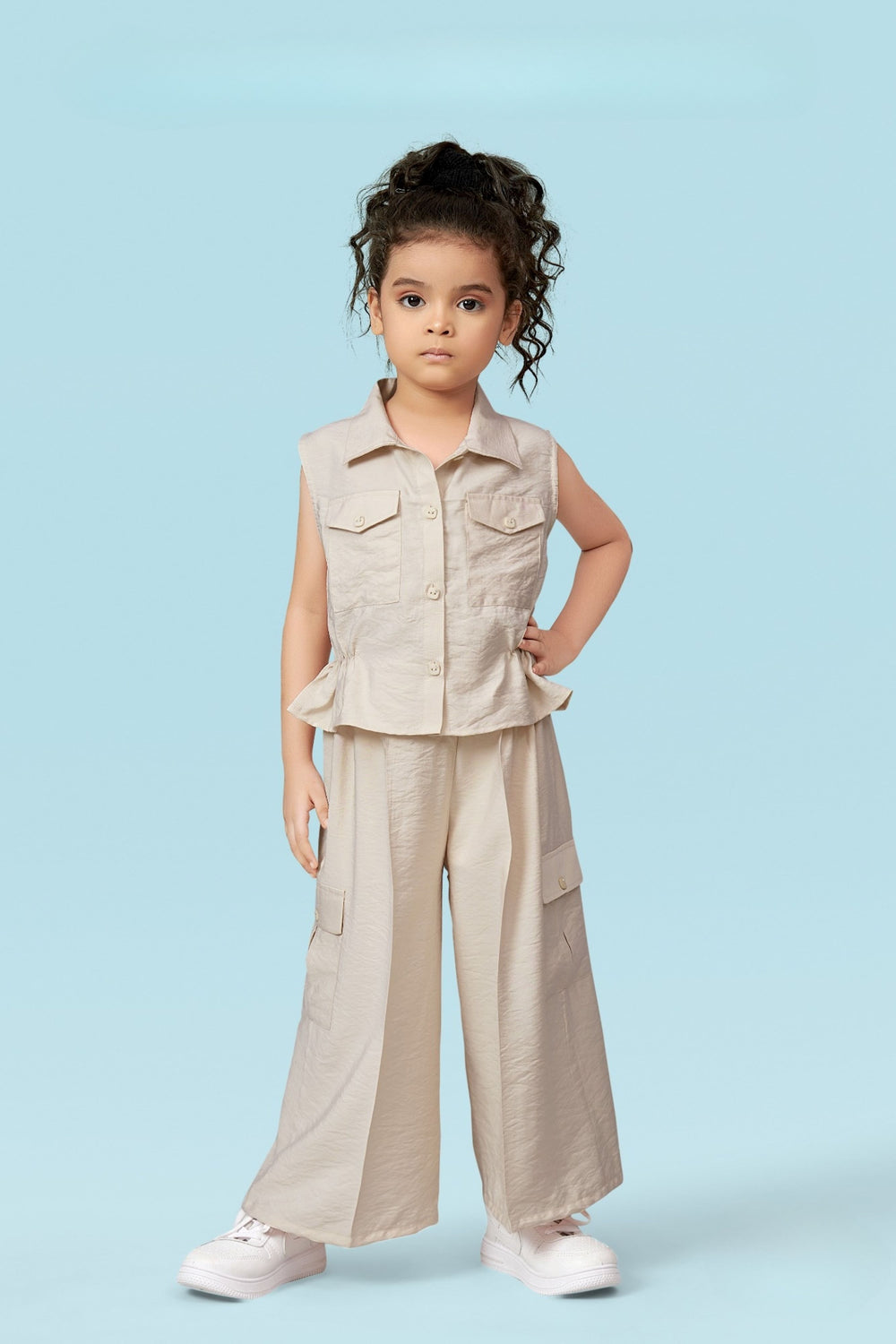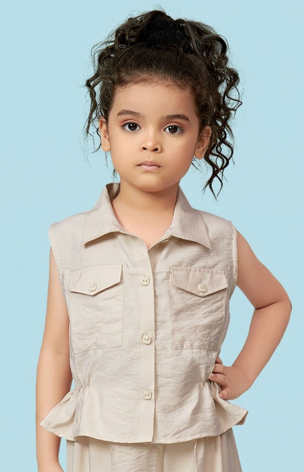 Upgrade your little fashionista’s wardrobe with this trendy and versatile co-ord set in a classy beige tone. Featuring a smart sleeveless collared top with utility flap pockets, paired with wide-leg cargo-style pants with side pockets—perfect for a modern, chic, and effortless look. Ideal for casual outings, birthdays, or travel looks!