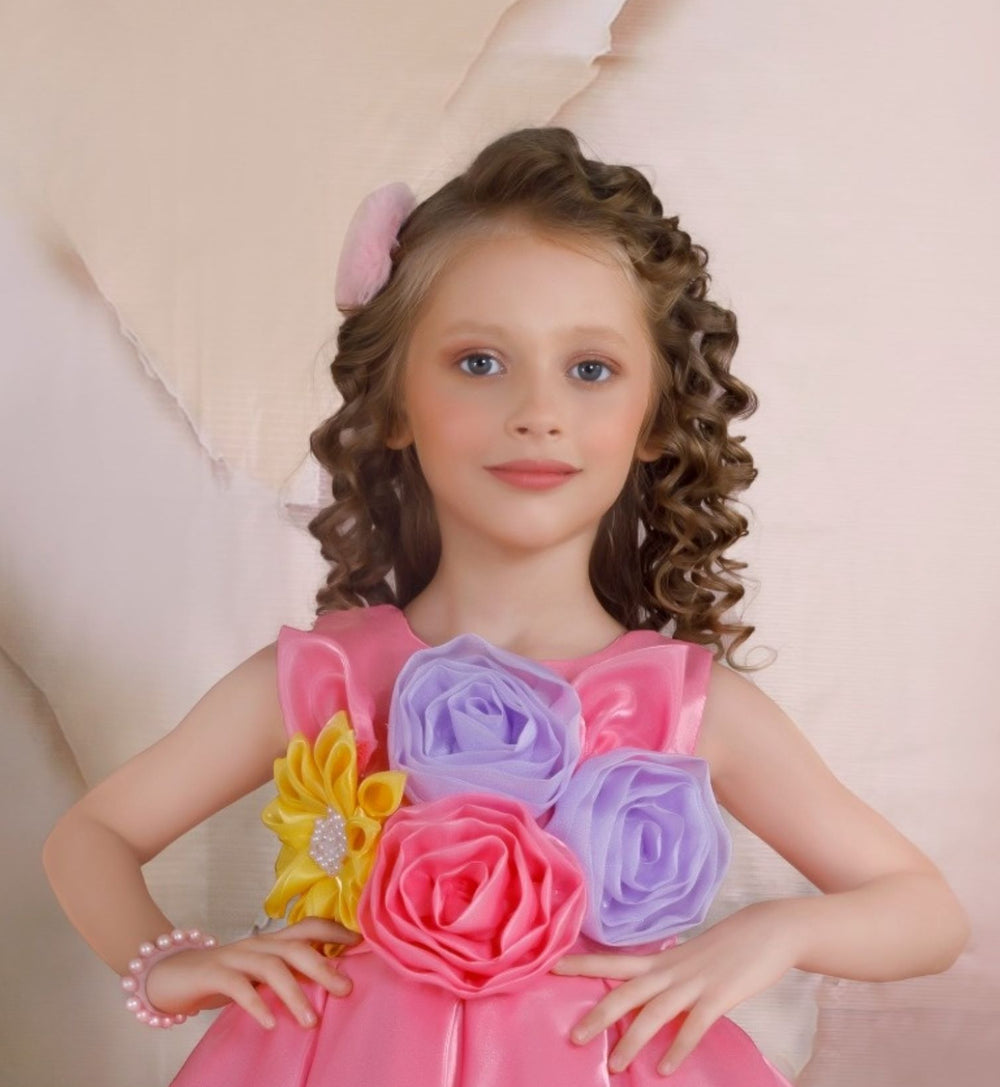 Brighten up your little girl’s wardrobe with this charming Tomato Pink Satin Party Dress. Designed with vibrant 3D floral appliques in lavender, rose pink, and sunny yellow, this sleeveless frock brings a burst of color and joy to any celebration. The shiny satin fabric, comfortable fit, and flowy twirl-worthy skirt make it an absolute favorite for birthdays, festive events, weddings, or photoshoots.